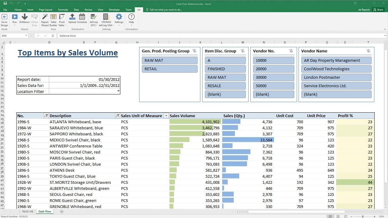 まず、ExcelをベースとしたツールであるJet Reportsを最初にご紹介します。Jet ReportsはDynamics ERPのデータベースを直接参照可能なレポート作成ツールで、レポート作成には複雑なプログラミングを要求しません。データの出力先がExcelのため、レポートのレイアウトやグラフ挿入、フィルタ機能、時間軸分析までExcel標準の機能を使いながらの分析が可能な事が特徴です。